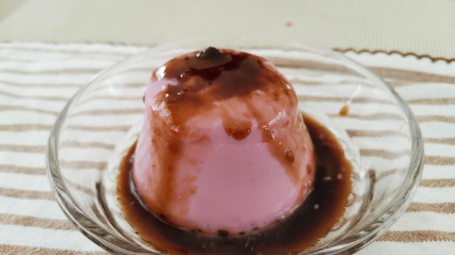 次はデザートの「カスタード・タロー・プリン」です。普通のカスタードプリンを作る途中に「タロー(タロイモ)」の香料・着色料をぶっ込んだ作品。