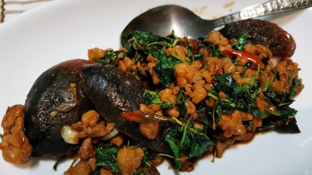 次はピータン入りパット・ガッパオです。これは嫁氏の作品。ピータンを先に炒めてからひき肉、ガッパオ、ニンニク、唐辛子を炒めて味付しました。