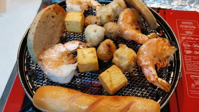 練り物とエビの網焼きです。薬局横の串焼き屋さんで買った練り物と冷凍エビを網焼きで頂きました。