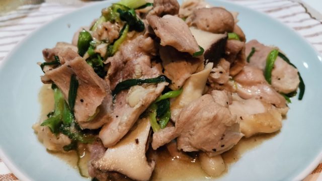 肉炒めです。単純にメニューを考えるのが面倒だった。カチカチに凍った状態の鶏ももと豚肩ブロックを力ずくでカットして、凍ったままの状態で炒めた逸品。エリンギも冷凍状態をぶっ込みました。