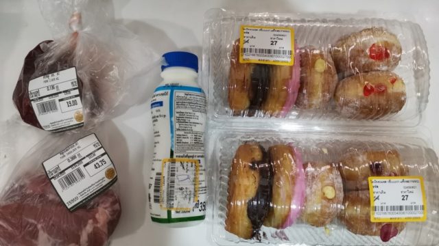 とりあえず50バーツ以上買えば割引出来るとの事なので、豚肩ブロック、豚レバー、半額牛乳、半額1BUY1のドーナツを購入して合計99バーツです。