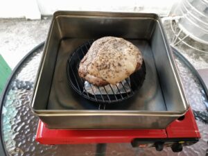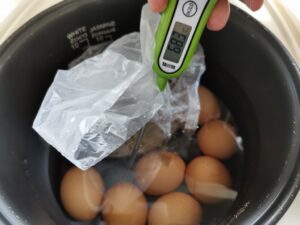 炊飯器の保温で豚肩肉は3時間、温泉卵は30分でOK。豚肉は乾燥させて7分程熱燻した。