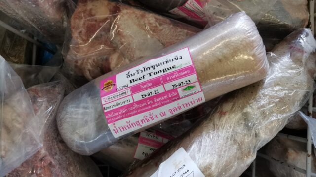 冷凍コーナーの「牛タン」1kg260バーツ(約980円)です。めっちゃ買いたかったけれど調理法とかよく解らないので買えず。皮剥いて薄切りして焼肉とか出来るのかな?