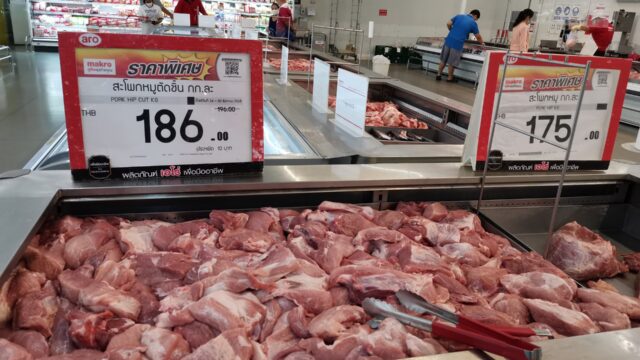 豚肉は1kg170~190バーツくらいで鶏肉に比べれば値上げも収まってきたのかなぁ。過去の100バーツ以下とかに戻ることは無いのだろう。