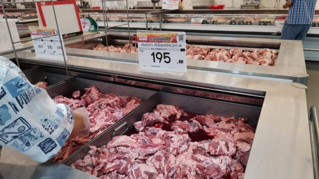 俺氏がお世話になる牛肉(トリミング肉)は1kg195バーツ。鶏と豚は値上がりしたけど牛肉はあまり変化がない気がする。豚肉の値段で牛肉買えると思うとお得感が有る?