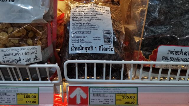 牛トリミング肉(牛すじ)195バーツ俺氏の食パンに必要なレーズンは1kg105バーツ。これも最安時に95バーツ位だったのでそれ程値上げされてる感は無い。俺氏が買うレースンは最安品なので、玉に枝が混入していて食べた時固くてびっくりする。