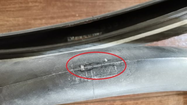 どうやら新しく貼ったガムテープの表面がつるつるで、中古のリムテープが偏り、端のエッジ部分でチューブが切れた模様?それともチューブの噛み込みかなぁ?