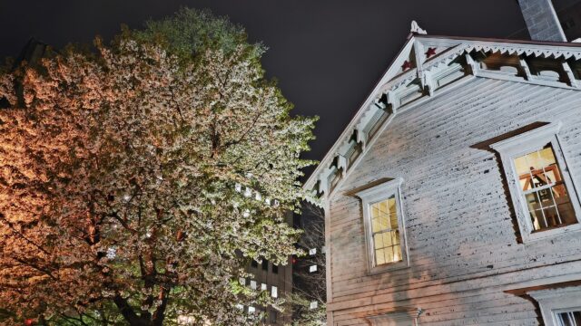 時計台の横の木が桜っぽいけど暗くてよく見えなかった。