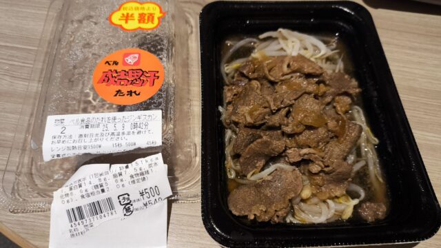おにぎりとか物色中にお弁当コーナーに半額見切り品の商品を発見。ジンギスカンですぞ。