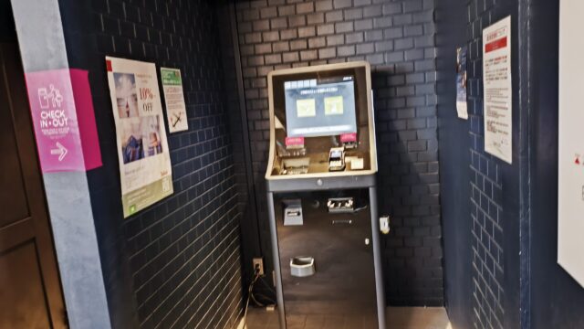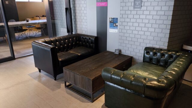 自動チェックイン機のスペースは共有スペース(元飲食店?)となっていて自由にくつろげます。