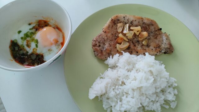 豚ステーキと温泉卵。豚ステーキは美味しいけれど、調理前に肉を叩いたり、揚げガーリックを作ったりで意外と手間がかかります。でも見た目がちょっと豪華で好き。