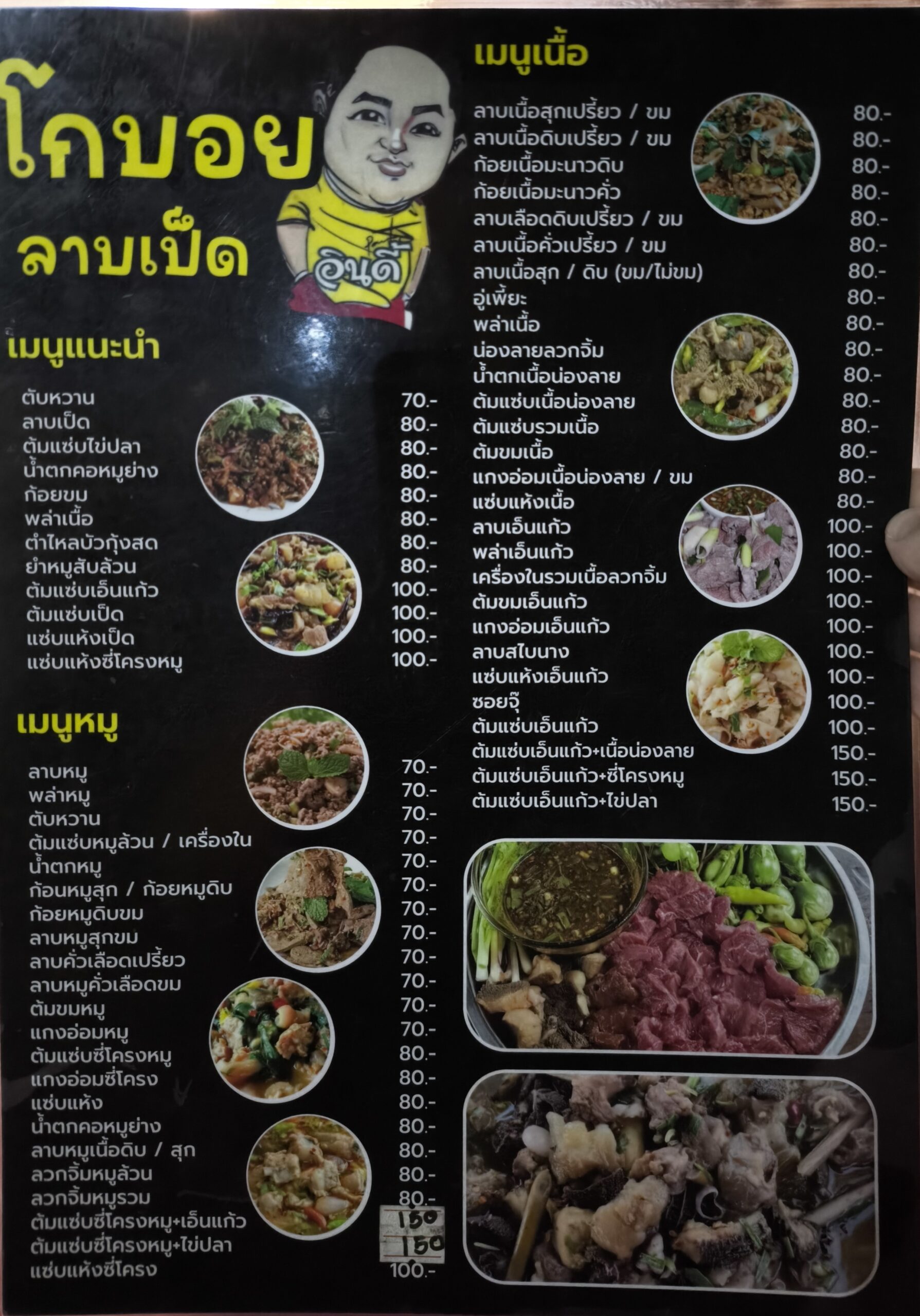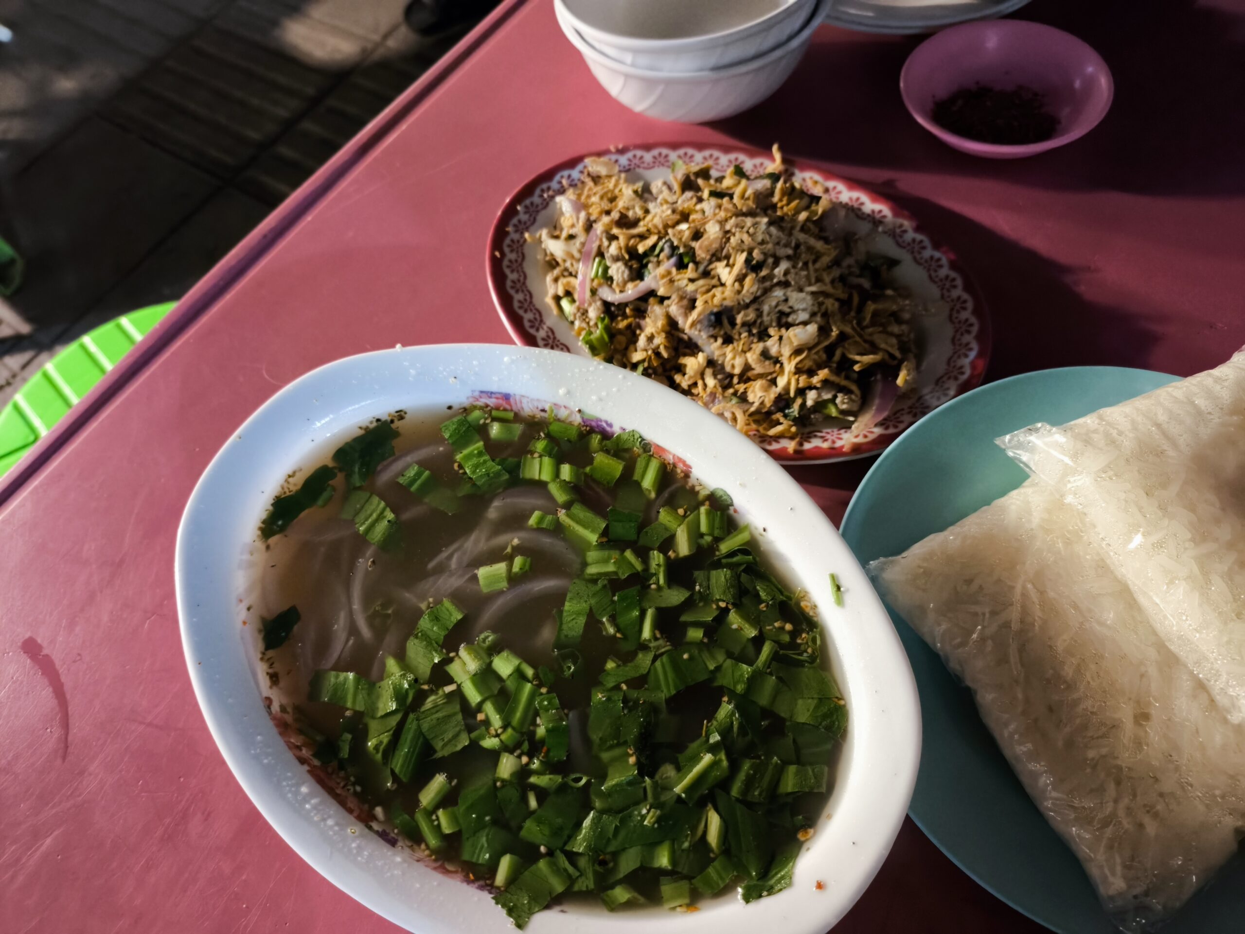 アヒル肉のラープ80バーツ(約400円)、牛アキレス腱の辛いスープ100バーツ(約500円)、カオニャオ2個、氷&水で合計220バーツ(約1100円)です。