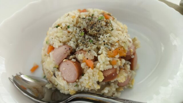 冷蔵庫の食材が残り少なくなったので、手抜きで美味しいソーセージ入りチャーハン作成。