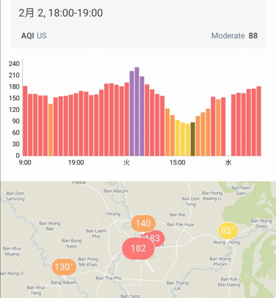 ホント大気汚染が深刻な状態が続いて基本AQI150(健康に良くない)を維持してます。