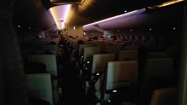 機内はほぼ満席。俺氏は通路側を予約してあるのでトイレの移動は余裕でした。今回のZIPAIRはエアコンが弱めでちょっと汗ばむ感じでしたねぇ。