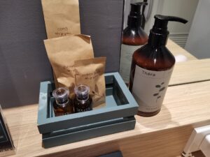 その他の設備としては部屋着(ガウン)、コーヒー紅茶、アメニティ、水4本が準備されてた。おそらく水が足りない場合はもらえると思う。