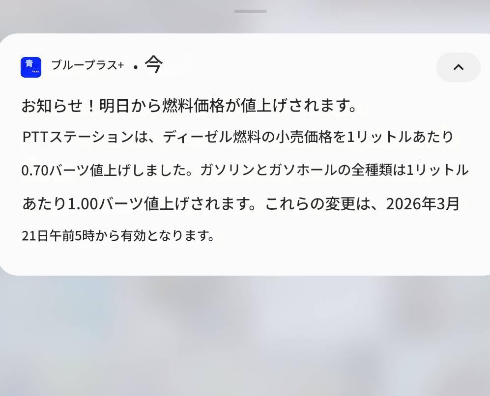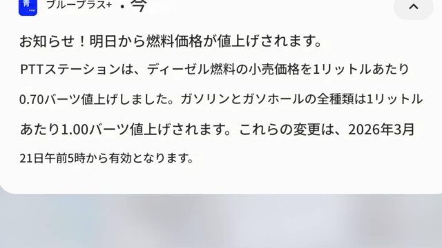 今日からガソリン1バーツ値上げになりましたが、イラン情勢が落ち着くまでは値上げが続くと思われる。