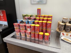 飲料(水・お湯)は無料なので、ペットボトルとか水筒あれば水の確保はOK。