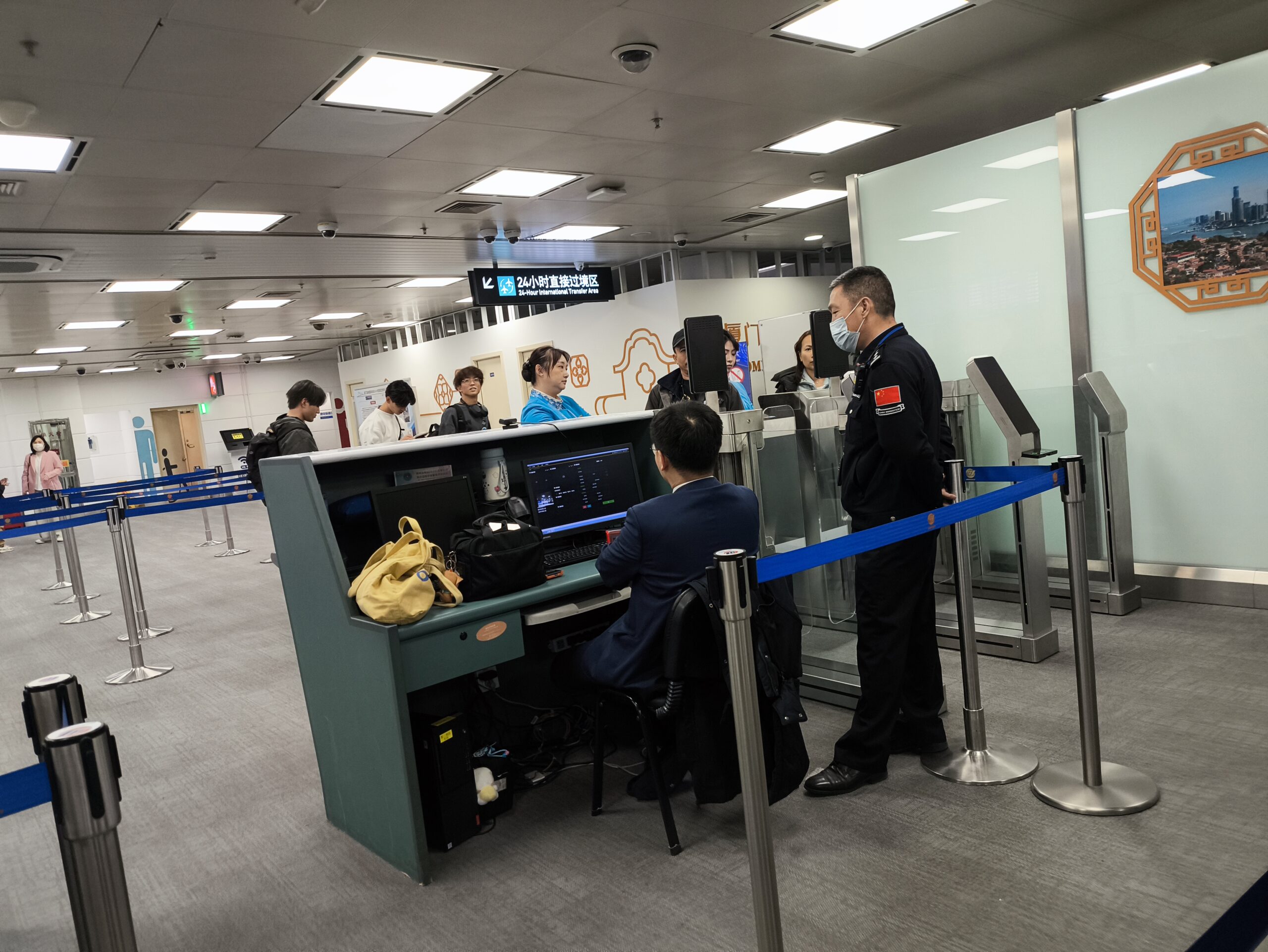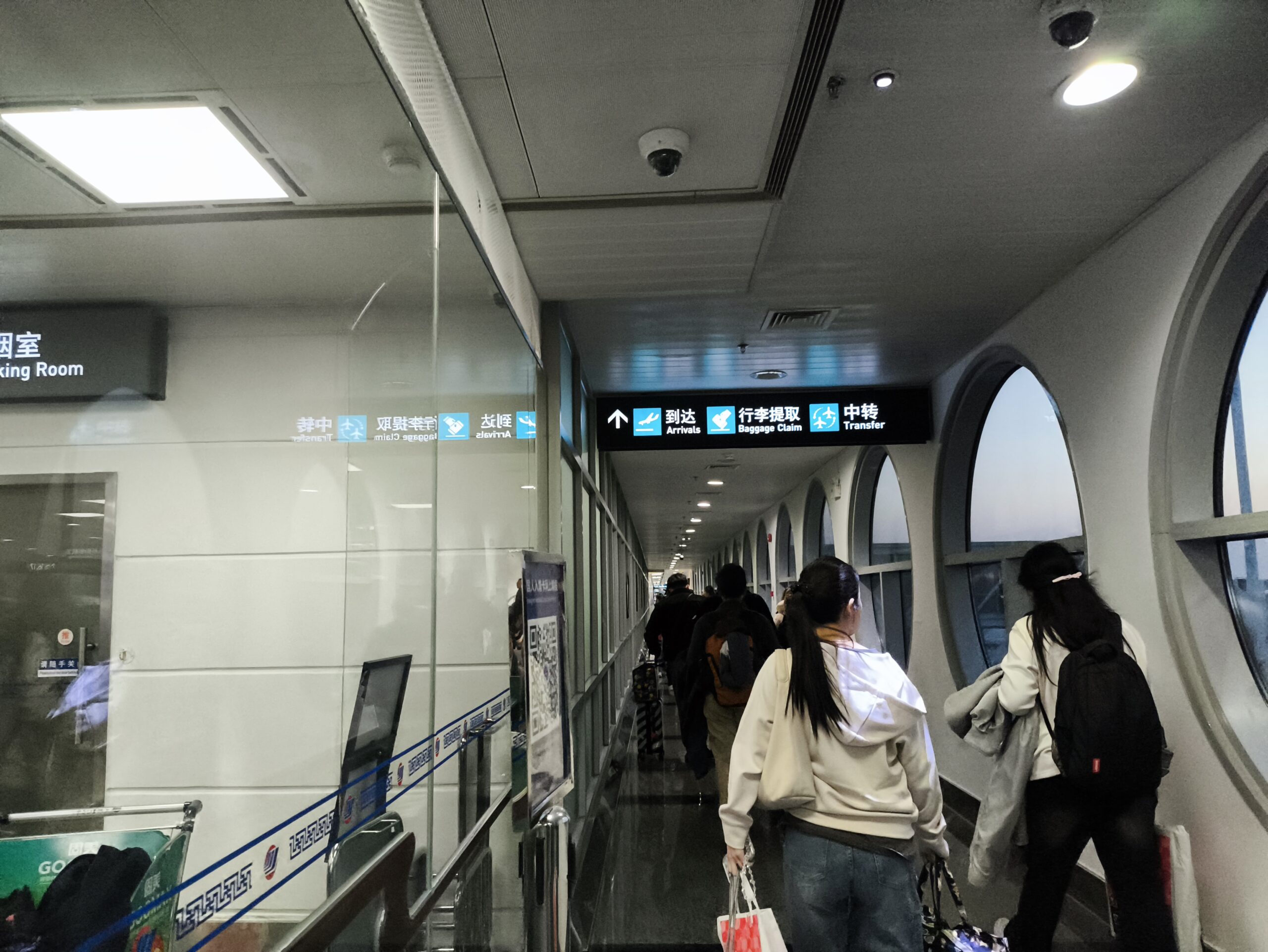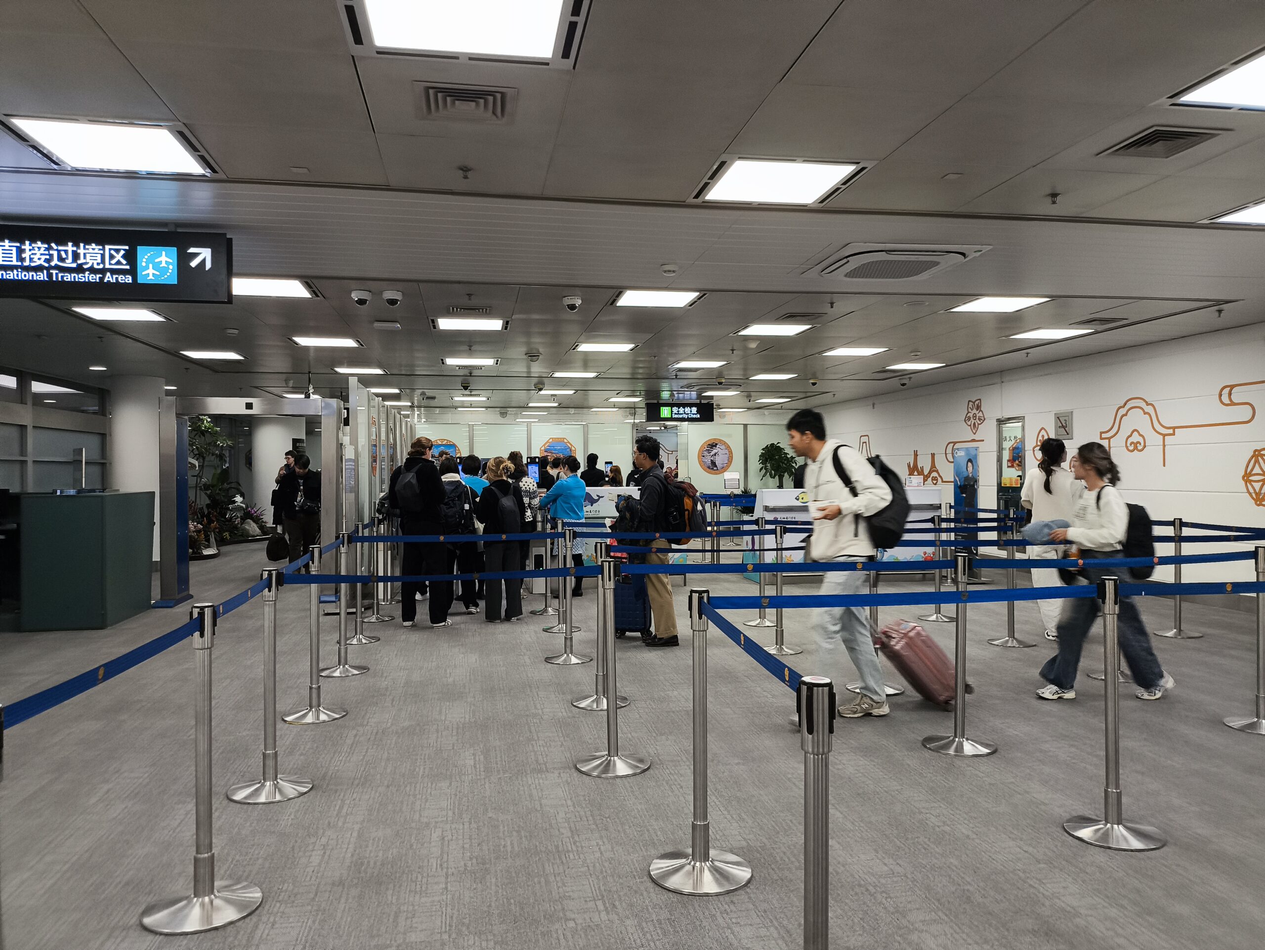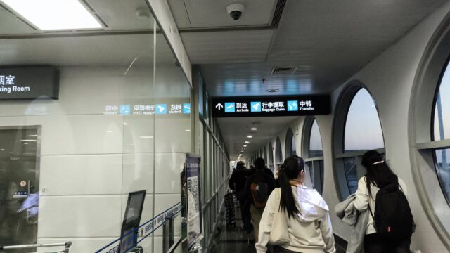 厦門空港の入国審査(乗り換え)はぼ一本道で迷う事なし。動画の通路をまっすぐ歩き、入国する人は下の階に降りて、乗り継ぎの人はそのまま先に進んで乗り継ぎのパスポートチェックと荷物検査を受ける流れです。