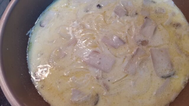 玉ねぎ、キノコ、肉を炒めて、牛乳&水でパスタを規定時間まで茹でれば完成。