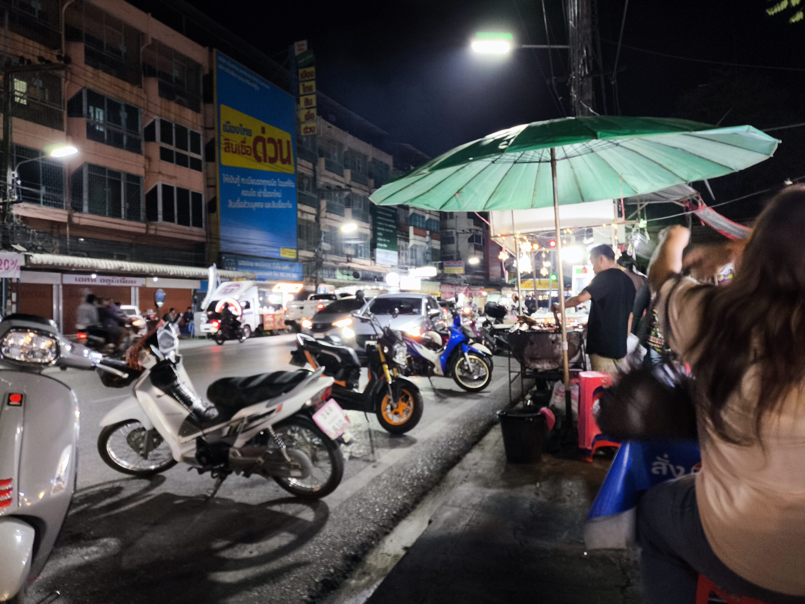 晩御飯を作るのが面倒だったので、嫁氏とバイク2人乗りで久しぶりに市内の屋台群のある通りに行く。