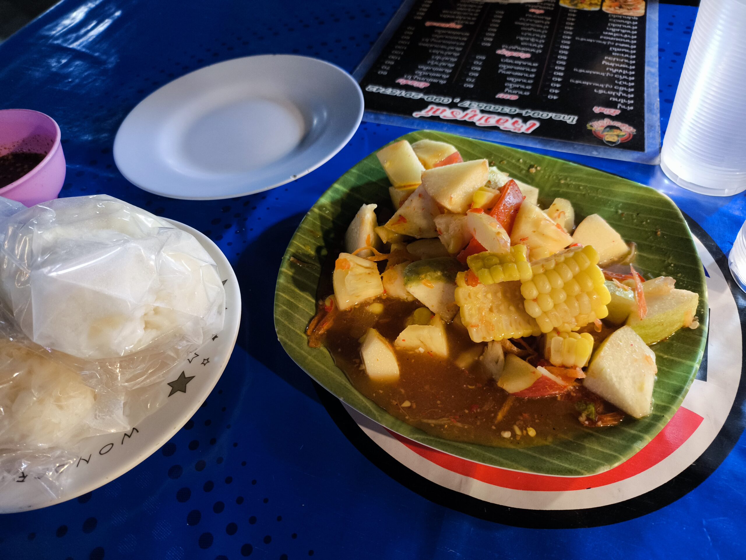 嫁氏はフルーツソムタム(辛くない)50バーツ、トムサップ(辛さ控えめ)60バーツ、焼き物セット70バーツとカオニャオ2個20バーツの合計200バーツ(約1000円)です。