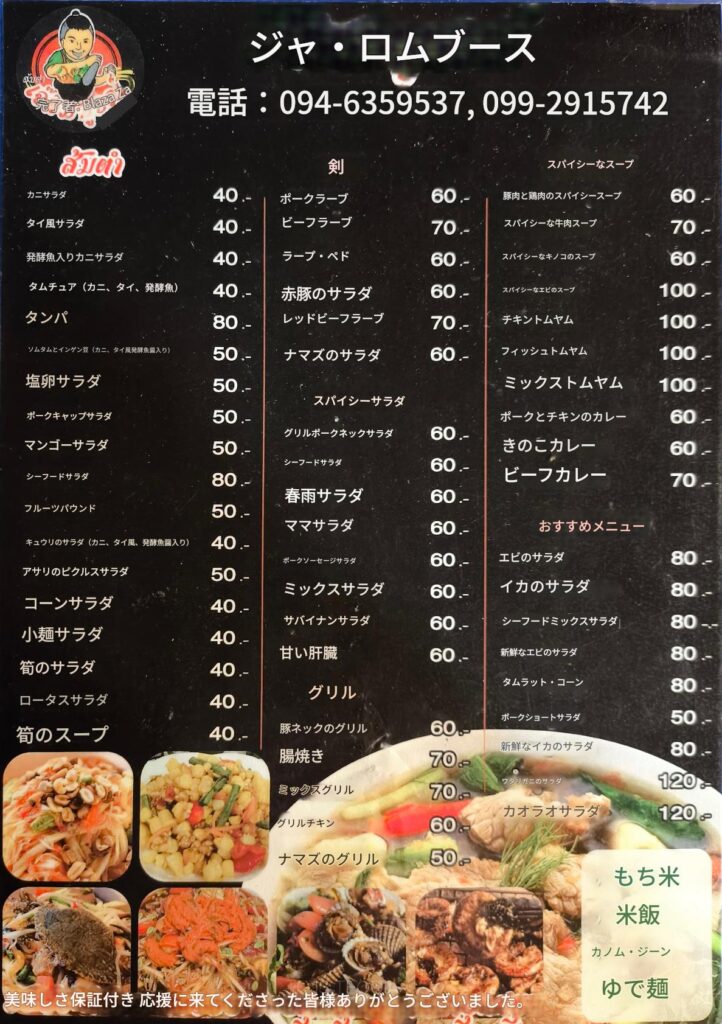 お店のメニューはこんな感じ。昨今のタイ物価からすると1皿50バーツ以下の商品もあるので高くはないです。