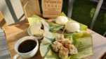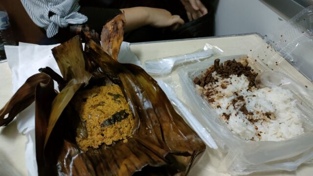 嫁氏が購入した魚の卵のカレー蒸し?と北部ラープとご飯です。どっちも味が濃い。