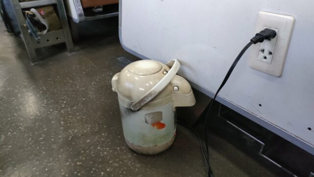 その後職員さんが湯沸かしポットを接続しに来て、絵面がカワイイので写真に納める。恐らく飲み物の車内販売に使われるのかな?