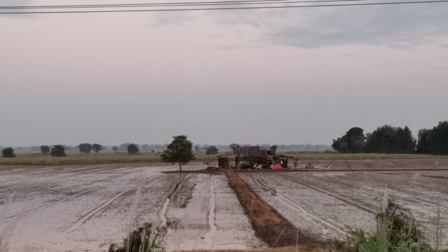 冬の田植え前に泊まり込み中かな?ピンクのテントと白いバイクが止まってますね。
