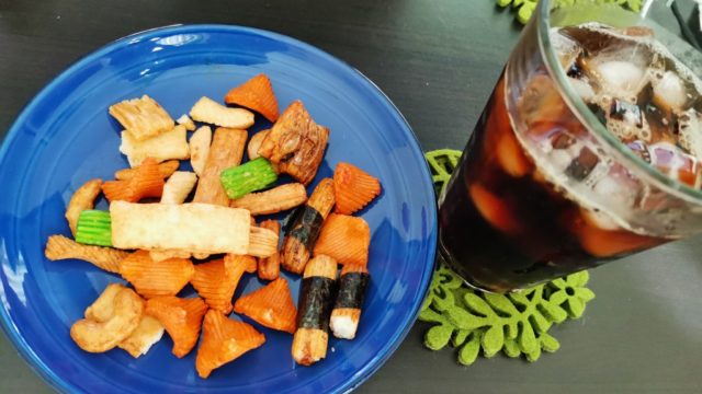 そんな感じで今日も10時のおやつで「あられ」を頂き中。急冷アイスコーヒーと共に贅沢な時間。