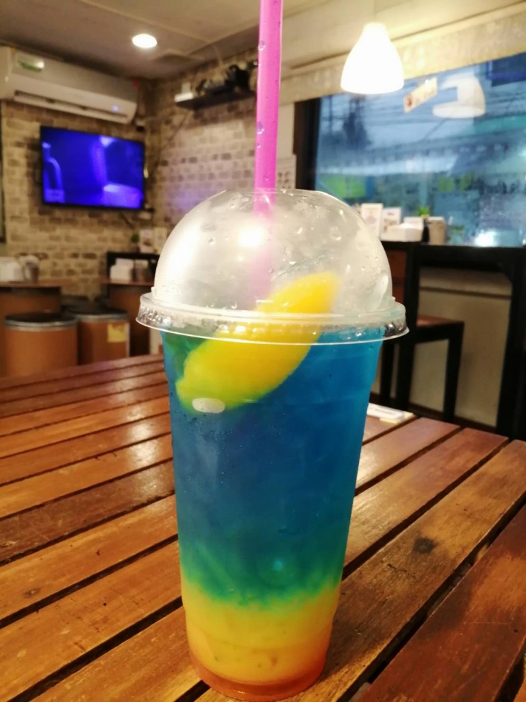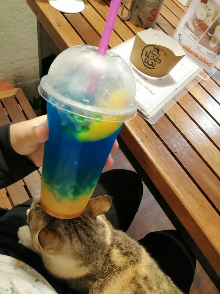 とりあえず嫁氏は、ブルーハワイ・マンゴージュース(タピオカ入り)50バーツ頼んで、自ら嫁氏の太腿に乗ってきたお年寄り猫をナデナデしてご満悦。