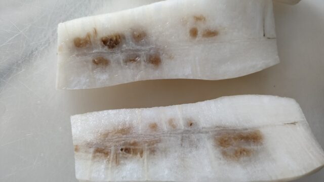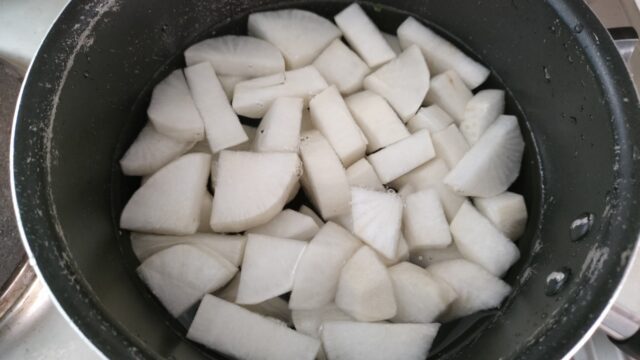 大根は一部が傷んでいて食べられそうな部位だけ下茹でして冷蔵庫に保存。まあ安物あるあるだな。