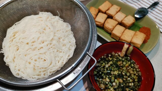 1パック3人前なので2束(2人分)を茹でる。流石にそうめんだけだと寂しいので冷凍庫の魚豆腐をオーブンで焼き、嫁氏は麻辣味で食べる模様。