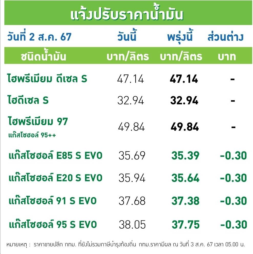 古新聞だけど8月2日にガソリンが0.3バーツ値下げされてた。