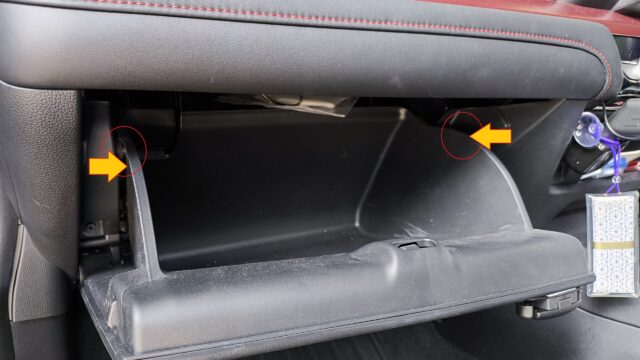 助手席のグローブボックスの中身を出して、赤丸部分を内側に押し込みながら手前に引くとストッパーが外れて取り外せるようになる。