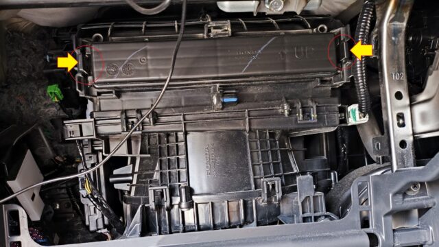 あとはグローブボックスを一番下まで開いた状態にして下側の軸を下側に引けば取れる。