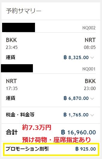 行きのフライトはバンコク発なのでキャンペーン対象外でハイシーズン価格でくそ高い。帰りはプロモの恩恵で少し安いけど、プロモ価格で正直高いと思う。