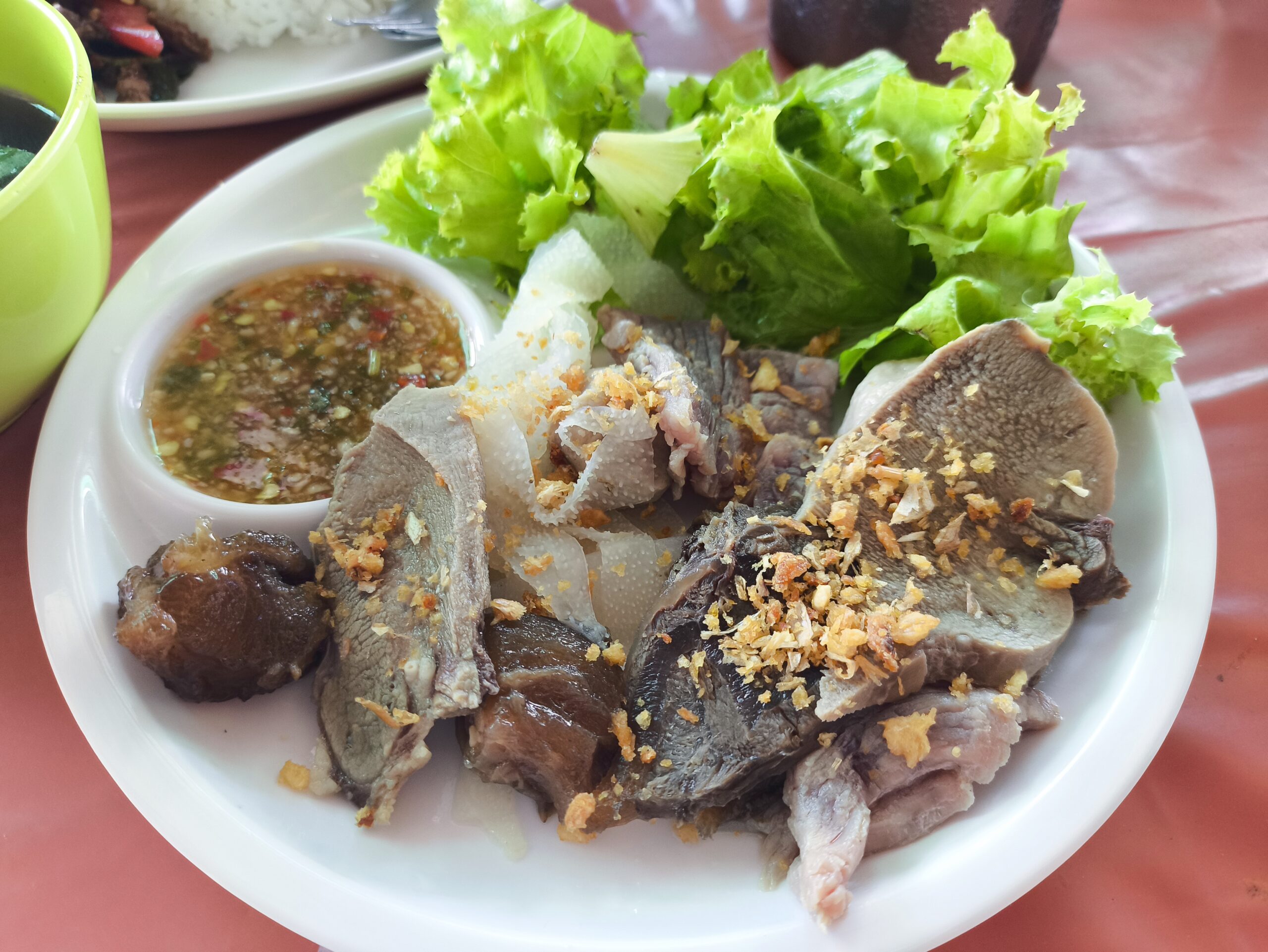 最初に来たのは湯通しした肉セットです。煮た肉と違い、さっと湯通しした固くない肉と思う。シーフード用の辛いタレが合うけど、辛いの苦手な人は少しだけつけようね。