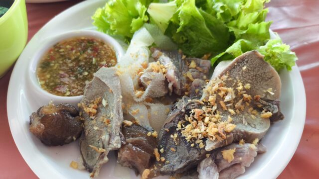 嫁氏は珍しい葉っぱ?の牛肉炒めを頼んでいたけど、在庫なしで普通の牛肉ガッパオ炒め60バーツ(約300円)になってた。俺氏はアキレス腱煮込みの汁なし麺60バーツ(約300円)、湯通しした肉セット80バーツ(約400円)、ペプシ20バーツ約(100円)でTOTAL220バーツ(約1100円)。