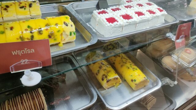 スポンジ生地とクリーム共にココナッツの果肉が入っていて美味しい。タイの安いケーキってスポンジがカサカサして味気ないけれど、この店のスポンジはシットリしていておいしい。