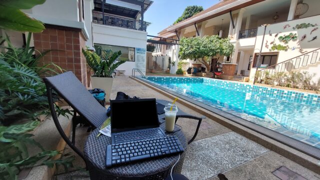 チェックイン時間が14時で我が家の到着が13時でまだ部屋の掃除が終わってないので、待ち時間中にプールサイドでお仕事をさせて頂く。