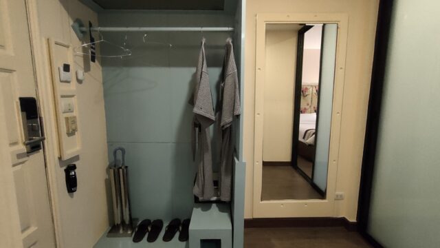 鏡の前に照明とコンセントが有り嫁氏には好評。クローゼットも大きくスリッパ、ガウン等のアメニティも充実してますね。
