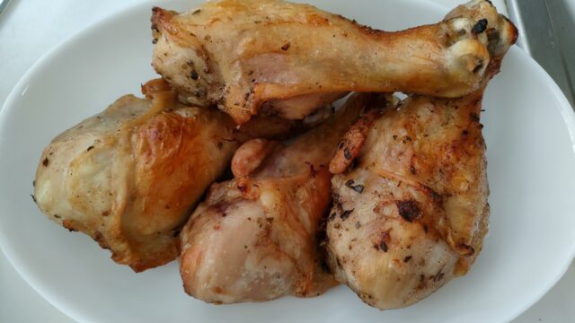 スーパーで鶏もも肉を買いに行ったら、ドラム肉しか無かったので、適当な味付けでオーブン焼き。