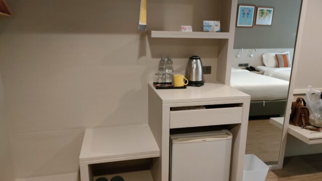 備え付けのスリッパも有って快適ですね。コーヒー、ポット、ドライヤーが有りましたがセキュリティーボックスは無いみたいです。