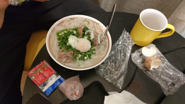 晩御飯は嫁氏が購入してくれたカオピアックを食べたのだけれど、ロビーで器やスプーンを快く貸してくれた。有難うございます。