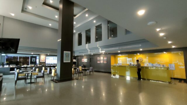 ロビーは広々として、奥は朝食会場になっているみたい。我が家は朝食無しプランなので詳細は不明です。