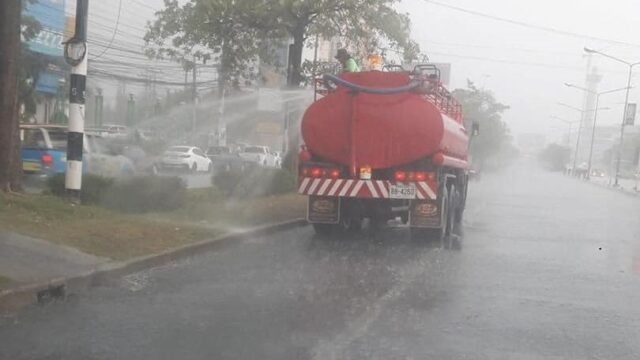 で、ネットで拾った勤勉なタイ人の画像。洪水する程の雨の中、決まった予定を遂行するために道路の街路樹に水を撒いてるのね。