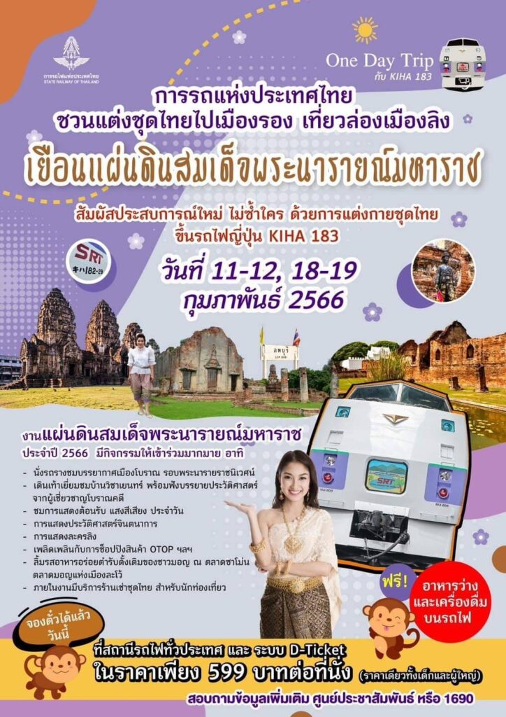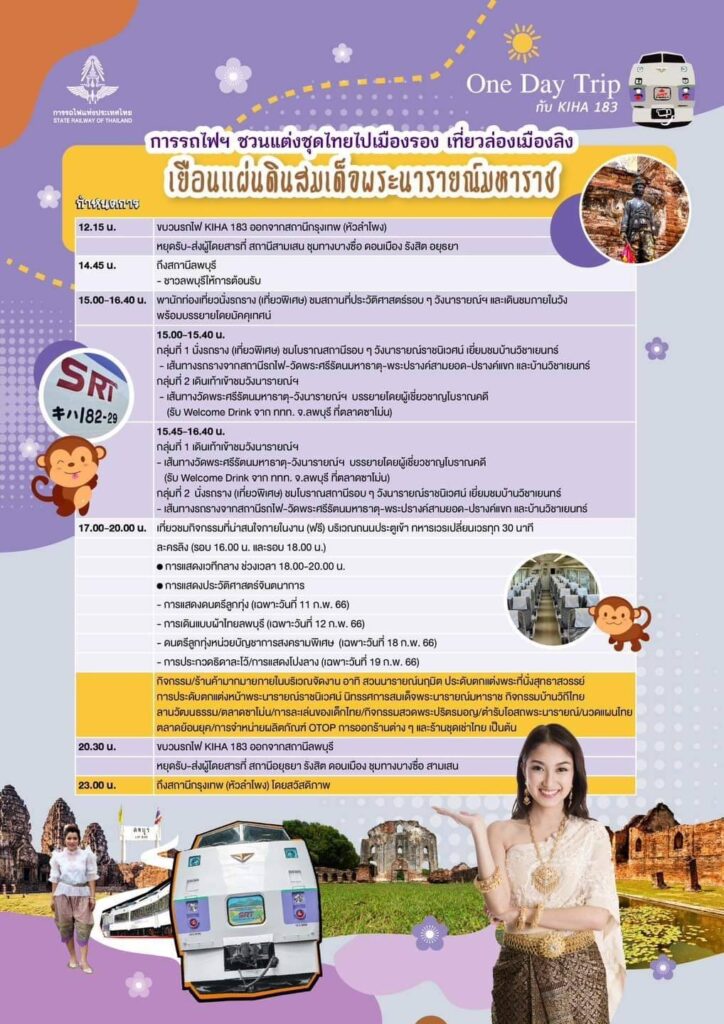 バンコク駅 (フアランポーン) を 12時15分にキハ951号線で出発し、午後2時45分にロッブリーに到着します。プラ・ナライ・ラチャニウェット ウィチャエン ハウスを訪問し歴史や物語を聞くとともに、 ウェルカムショーやエントランスロードでのフェア、光と音のアクティビティに参加、モンキーショーや歴史的公演、OTOP製品、ロッブリー県の地元製品。 そして音楽のパフォーマンスを見る コミュニティの生活様式に応じた芸術と文化の歴史パレードもご覧いただけます。 ソムデット・プラ・ナライ大王の礼拝式、奉納舞踊、レトロマーケット、ラヴォ娘コンテスト スタサワン宮殿などのさまざまな古代遺跡で花畑と一緒に写真を撮ります Phra Narai Ratchaniwet 内、Prang Khaek から KIHA 列車 952 番で戻り、午後8時30分にロッブリーを出発し、午後11時5分にバンコク駅に到着します。