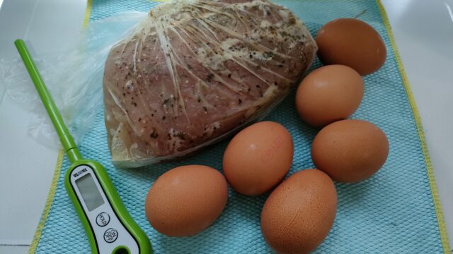 低温調理に使うお湯を有効活用する為に豚ハムと一緒に温泉卵も作るのがお得。
